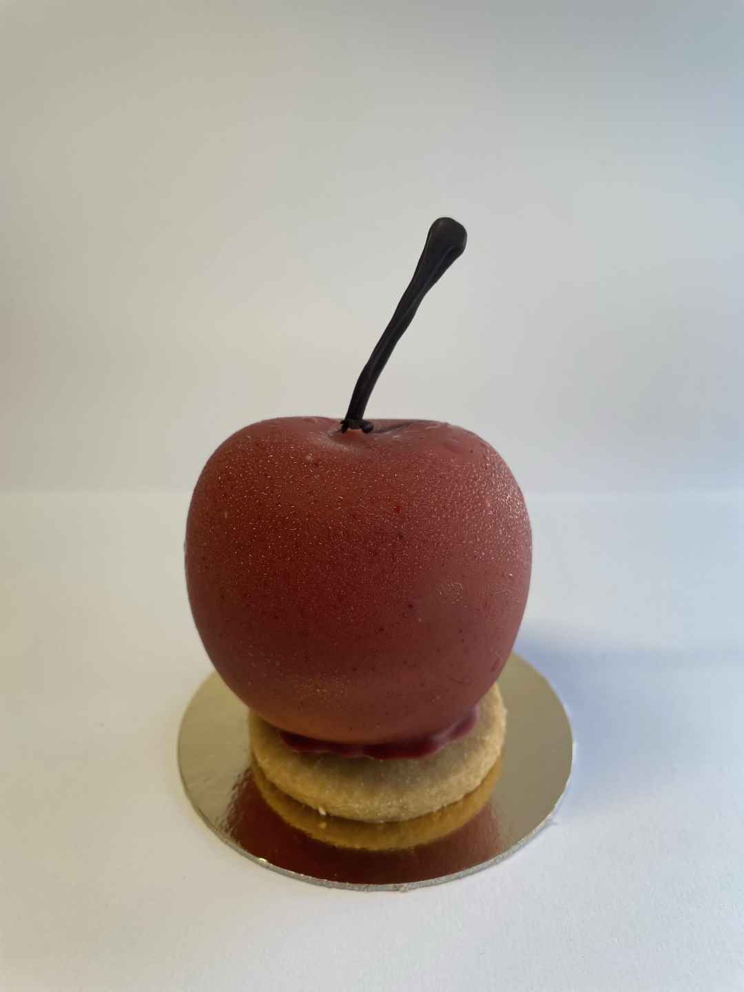Tökéletes meggy formába bújt lágy meggymousse, a belsejében intenzív meggyes gyümölcsréteggel. Kívülről fényes, mély meggyszínű, roppanós fehércsokoládé-burok teszi ellenállhatatlanná – nemcsak elegáns, hanem minden falatban a nyár zamatos ízeit idézi.