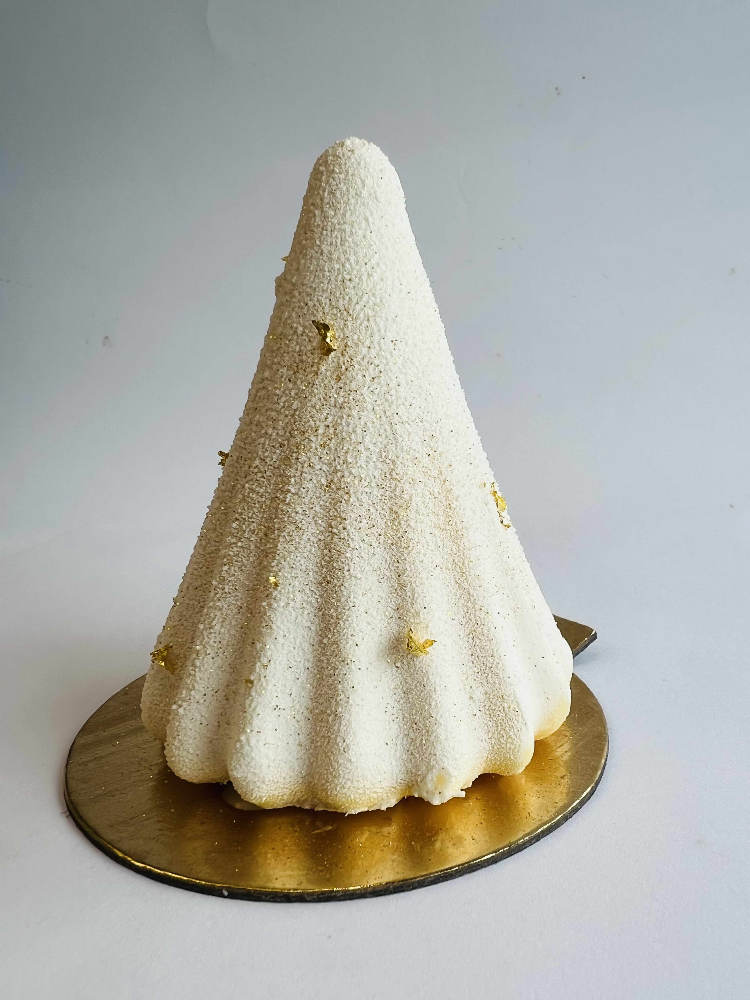 A külső réteget hófehér kakaóvajas bársonyspray fedi, amely olyan, mintha frissen hullott porcukorhó borítaná be az erdő legszebb fenyőfáját. A desszertre helyezett valódi 23 karátos arany lapocskák finom csillogása pedig ünnepi fényt visz minden szeletbe – ez a desszert nem csupán egy ízélmény, hanem maga a luxus ünnepi pillanatba zárva.