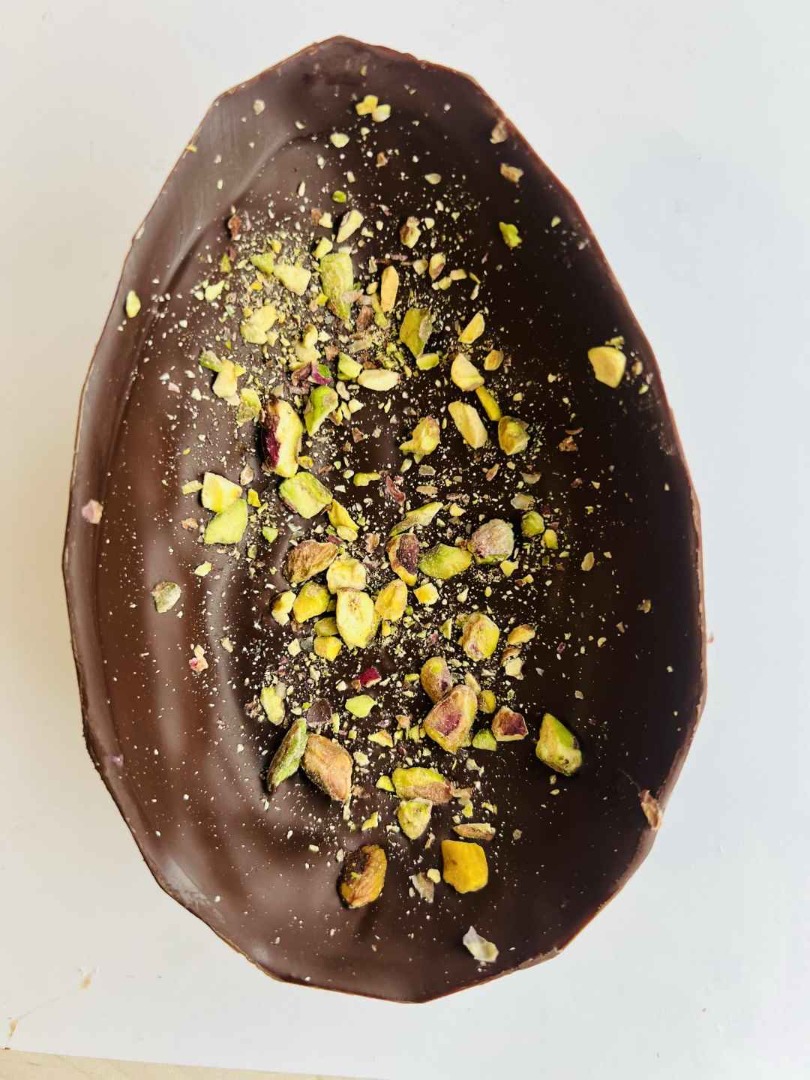 Húsvétra egy új kedvenc: étcsokoládé tojás, roppanós burokba zárva, belül selymes dubai csokoládés–pisztáciás krémmel töltve. Az intenzív kakaós íz és a lágy, pisztáciás krém izgalmas párosa minden falatban új élményt ad.
