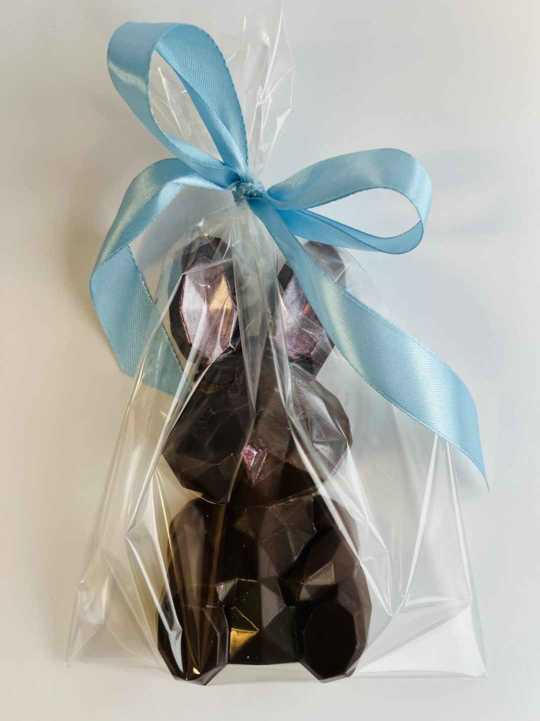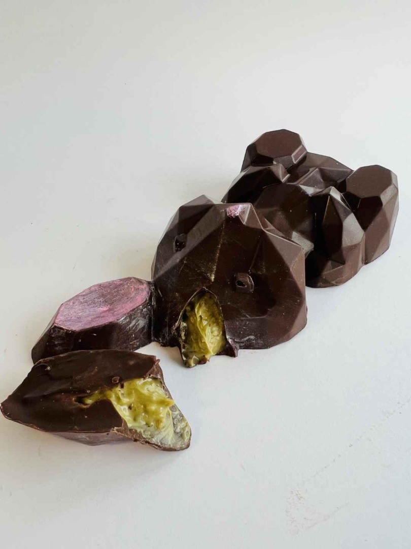 Az idei húsvét luxus újdonsága: étcsokoládé nyuszi, amelyet gazdag, dubai csokoládés–pisztáciás krémmel töltöttünk meg. Az étcsokoládé karakteres íze és a pisztácia krémes, keleties világa tökéletes harmóniában olvad össze minden falatban.