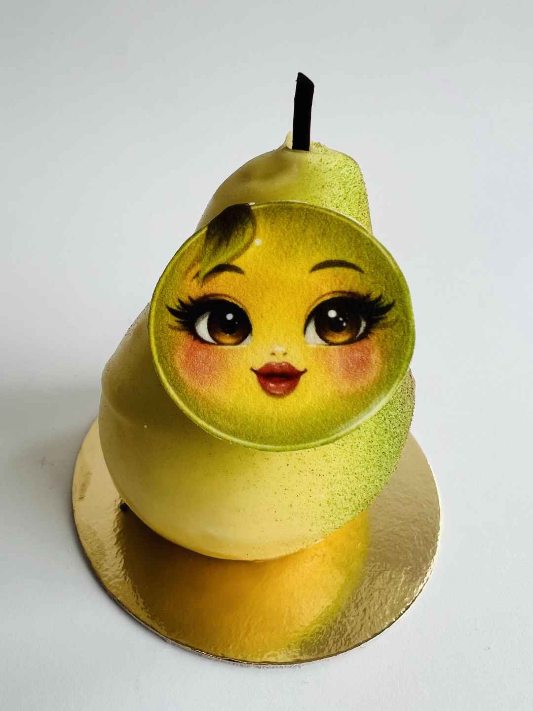 Ez az élethű, gyönyörű körte alakú desszert enyhén fűszeres, lágy körtekrémet rejt, szívében pedig egy mély, gyümölcsös körtezselét. Kifinomult, lágy ízvilága miatt tökéletes választás azoknak, akik a letisztult, természetes édességeket kedvelik.